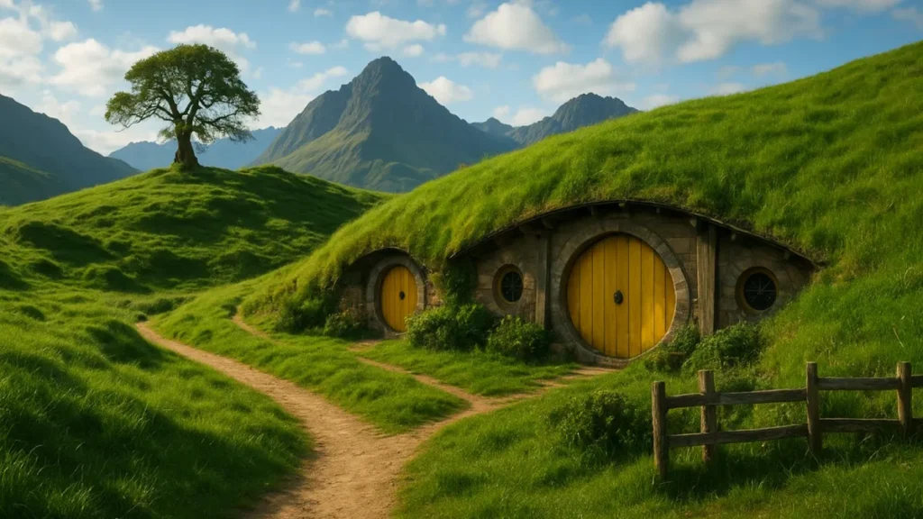 - Hobbiton: A vila dos Hobbits em Matamata é a réplica mais famosa. O set foi mantido como atração turística e recebe visitas guiadas.